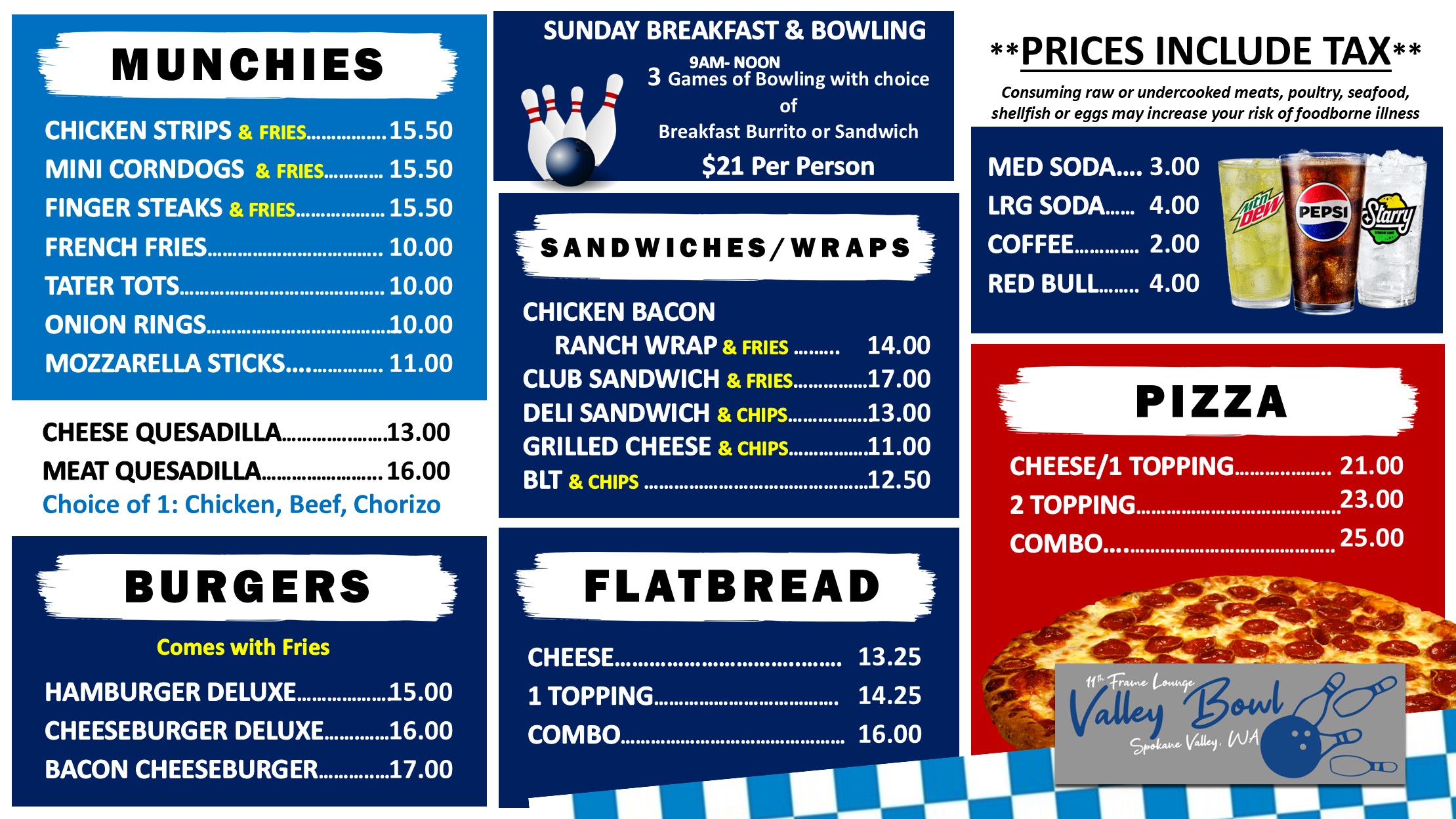 Relax before, after, or in-between bowling in our lounge with a signature cocktail or draft beer! Hungry? Don't worry, our amazing cooks in the Valley Bowl Cafe are serving up delicious meals all day and night. Check out some of our specials below, then come by and treat your tastebuds!